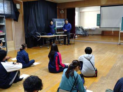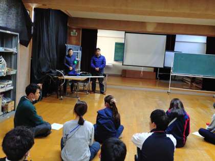放課後、防犯訓練を受けて警察の方を交えて訓練の反省や研修を行いました。