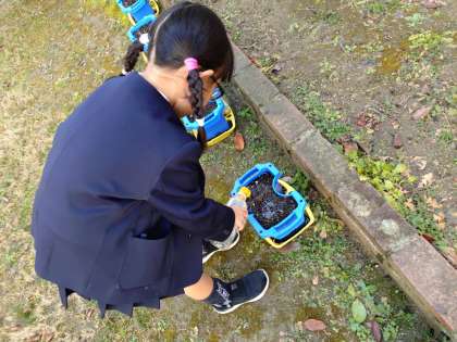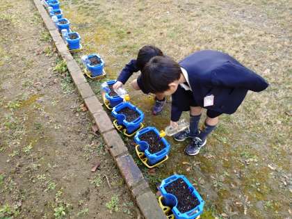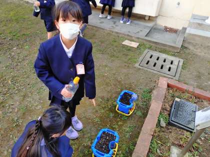1年生が中庭でチューリップに水をあげていました。芽がでてきています。