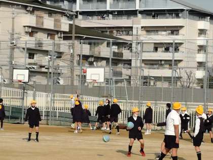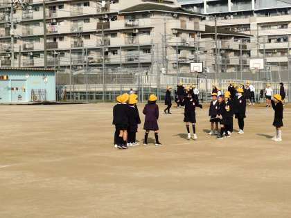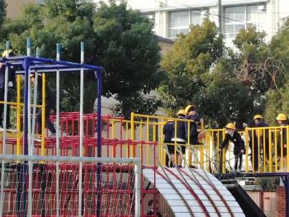 今週は比較的暖かく、たくさんの児童が運動場で遊んでいます。長縄、バスケット、遊具、おにごっこなどさまざまです。