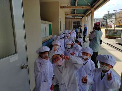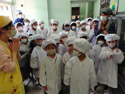 今日は1年生が6年生と一緒に給食を取りに来ました。