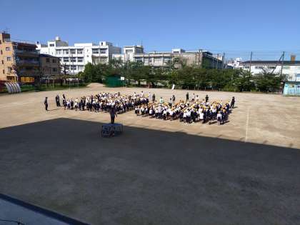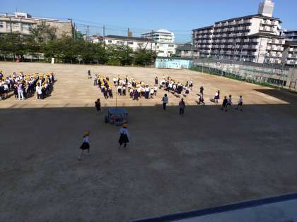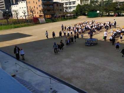 今日は運動場で児童朝会があります。子どもたちが教室から出てきています。