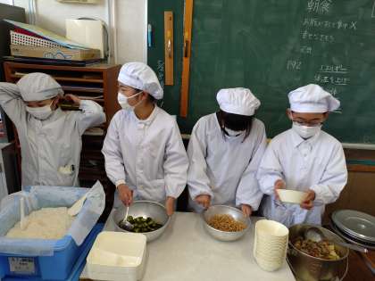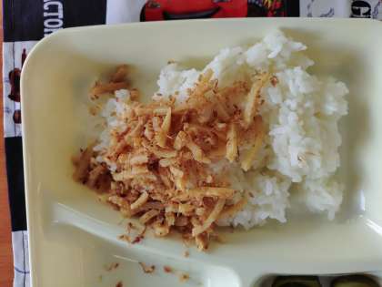 ごまかかいためはご飯にかけて食べます。ごまとかつお節のほかにタケノコが入っています。