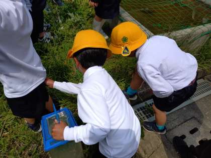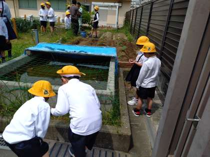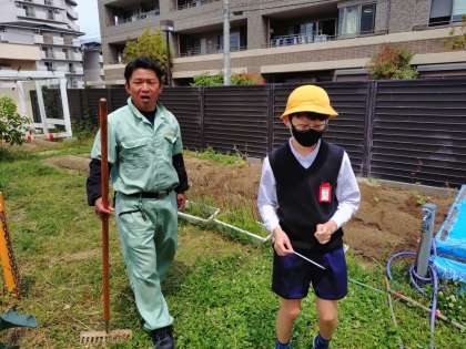 学習園に色々な学年がいました。栽培委員会が植えているところを1年生が見に来ていたようです。