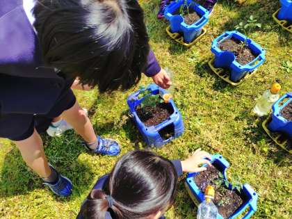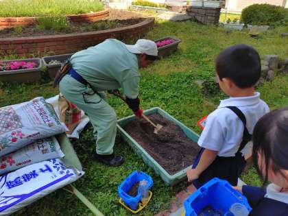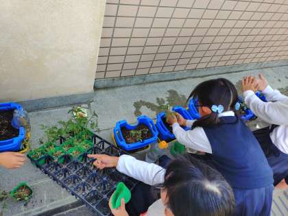 2年生が生活をしていました。ミニトマトを植えました。管理作業員さんに手伝ってもらって無事植えました。大きく成長してねと水をしっかりあげました。