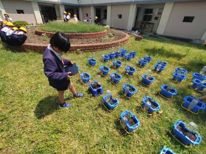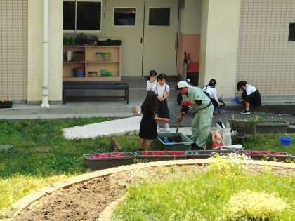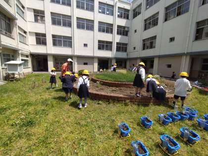 ミニトマトを植えてタブレットで撮影しました。休み時間は1年生が中庭にきていました。