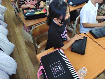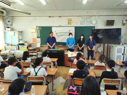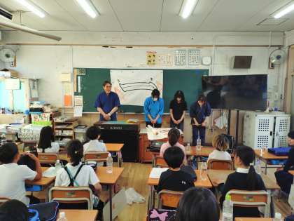 3年生が習字をしていました。初めての習字の時間、書道家宮田天風先生を初め地域の書道教室の先生が指導に来てくださいました。