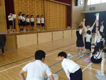 今日は集会です。イントロドンです。曲をきいて曲名を当てるのですが、番号に応じて屈伸やポーズをしています。楽しそうですね。