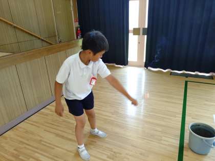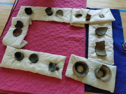 6年生が講堂で、出前授業を受けていました。土器を見て火おこし体験をしています。