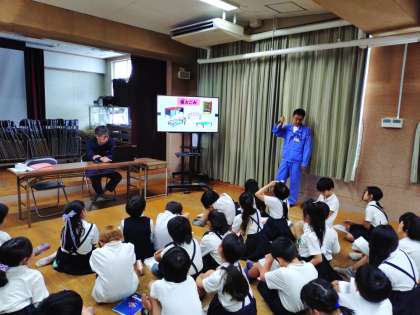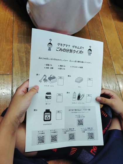 質問をしたり、パッカー車の中に乗ったりした上で3時間目は小ホールでゴミについて詳しく学習していました。学習したことを活かしてクイズに挑戦もしました。