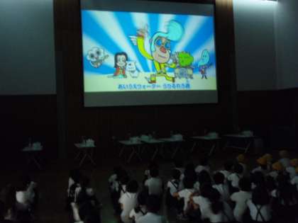 浄水場ではまず始めに、今年から始まった、じょう水ジョーの「水道ろ過ンロール」を観ました。