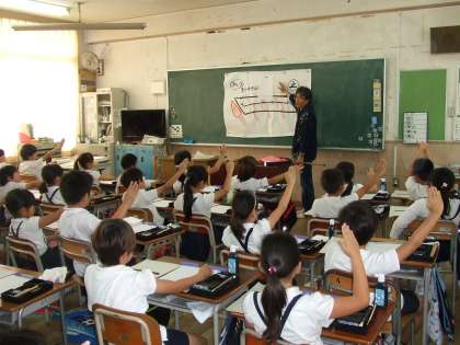 宮田天風先生から習字道具の使い方や筆の運び方を教えていただきました。児童もしっかりと先生の話を聞いて初めての習字を楽しんでいました。