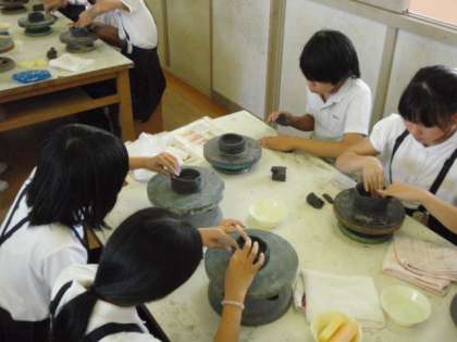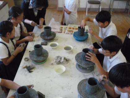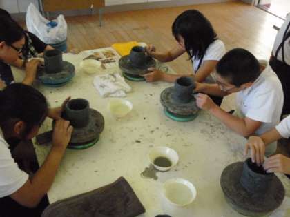 手回しろくろを使って子どもたちは工夫を凝らした「ペン立て」の作製に夢中になっていました。