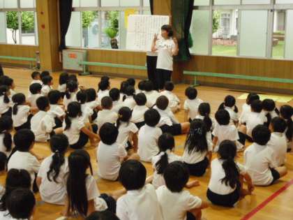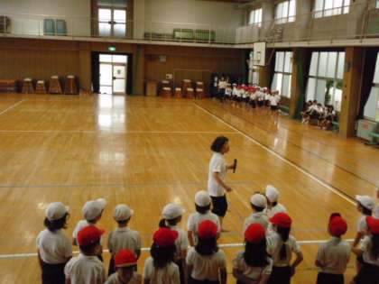 6月13日(月)に昨年まで本校で勤務していた鶴賀とも子先生に来ていただいて、講堂でリズム運動をしていただきました。