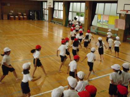 子どもたちは、講堂の中をピアノのリズムに合わせて走ったり、跳んだりしていました。