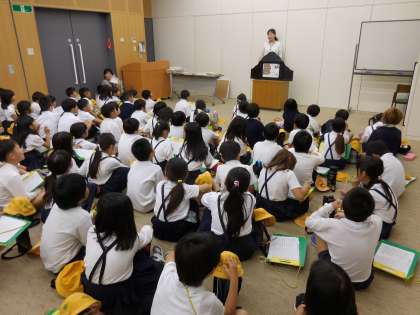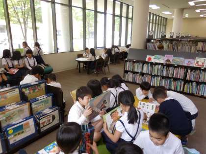 沢之町公園に着くと,図書館の見学に行きました。館長さんの紙芝居を静かに聞いたり,自分で読みたい本を見つけて読んだりしました。たくさんの本があることに驚いていました。