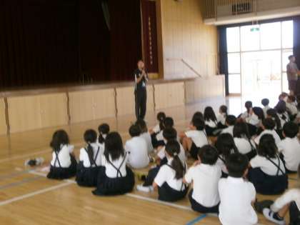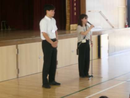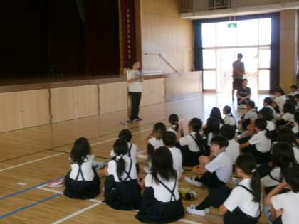 今朝の児童朝会は講堂で行いました。校長先生から教育実習生の紹介がありました。本校の卒業生で、子どもたちの先輩になります。2週間ですが、主に1年2組の教室ですごします。