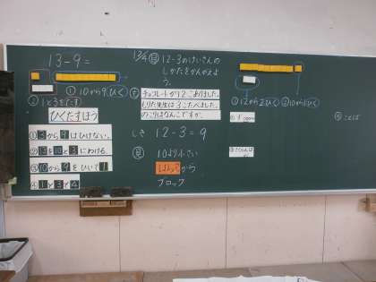 一年生が算数をしていました。繰り下がりのひっ算です。