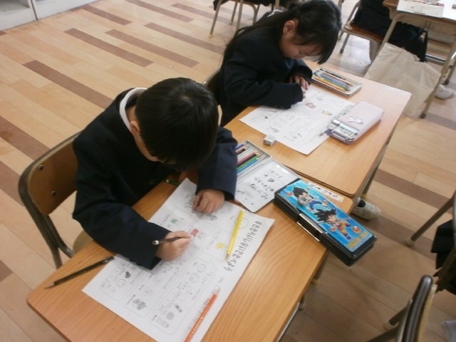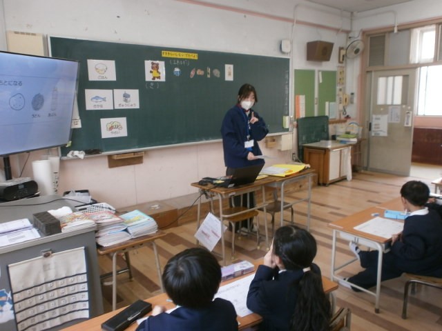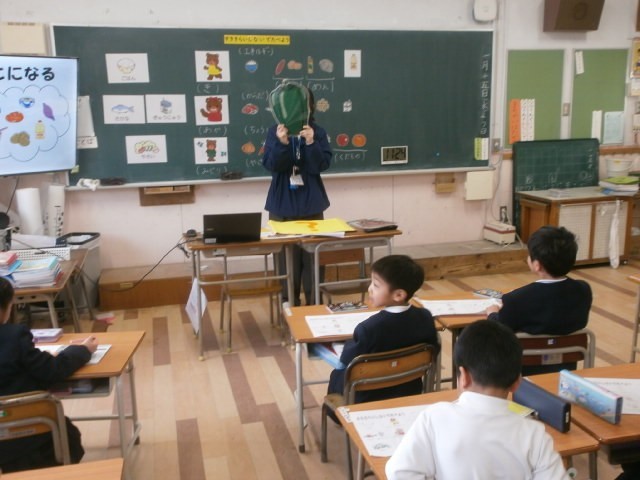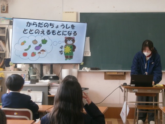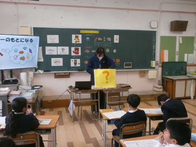 一年生の栄養教育の様子です。赤、黄、緑の食べ物について学習しました。最後はクイズで学習を深めていました。