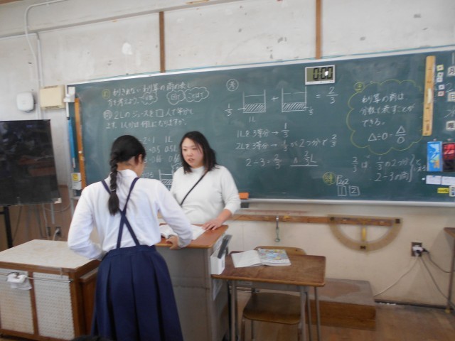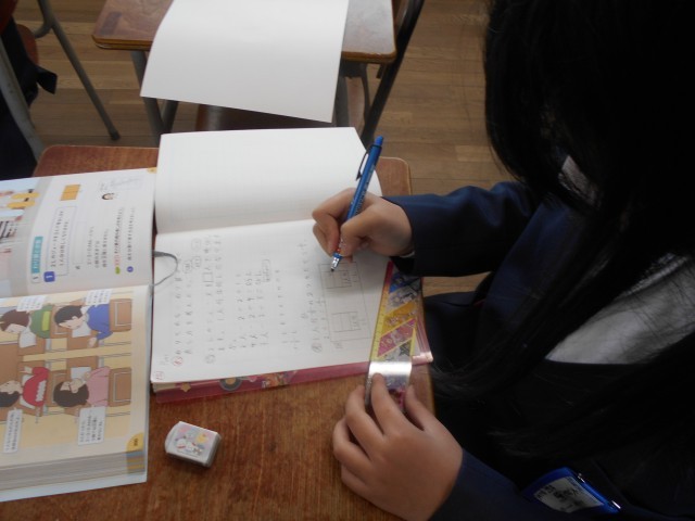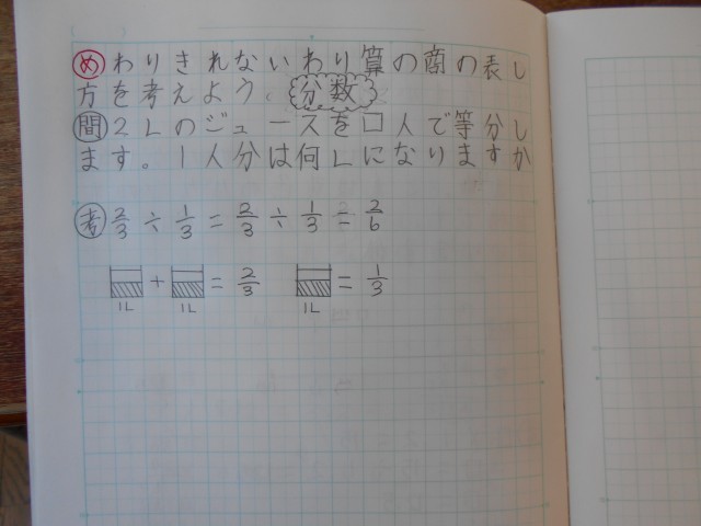 5年生が算数をしていました。割り算の式を分数で表す学習です。