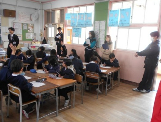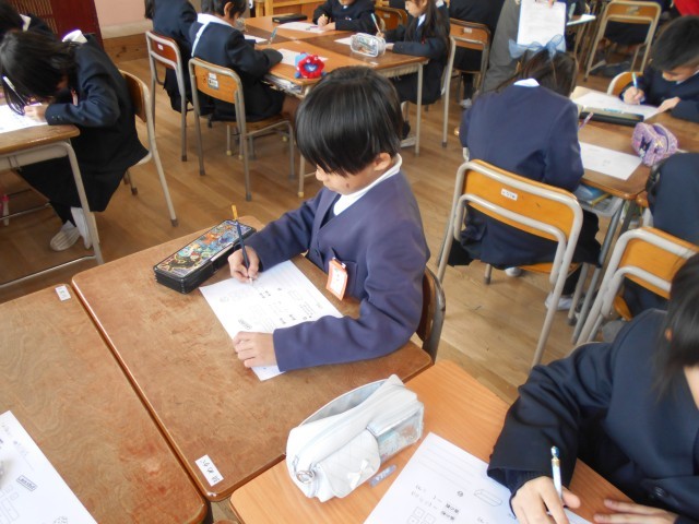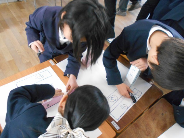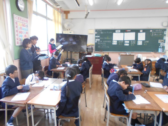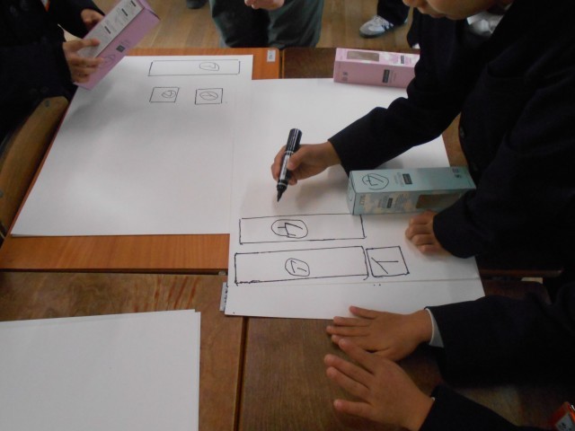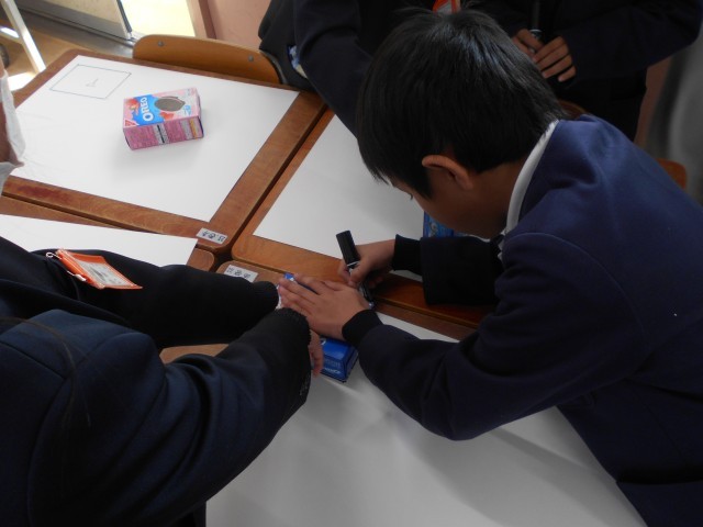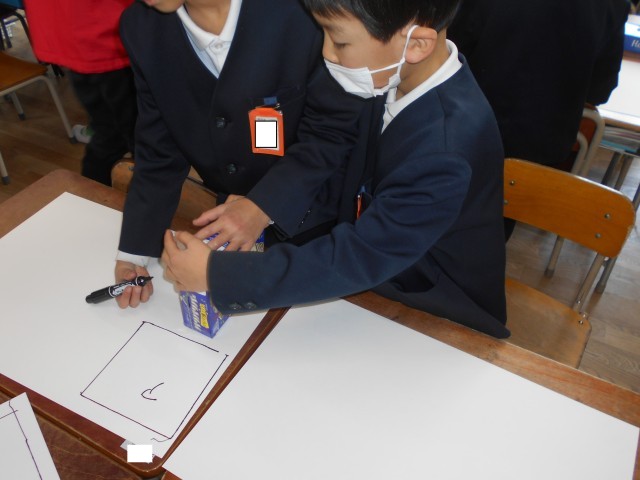 2年生が算数をしていました。研究授業で校内の先生がたくさん参観しています。箱の形の学習で箱を写し取る学習を班で協力して行っていました。2年生とても集中して学習していました。