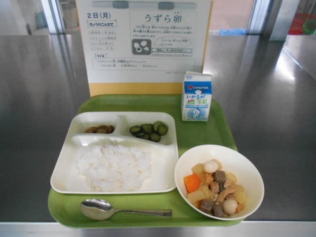 ご飯です。関東煮(おでん)でした。うずら卵、ちくわ、大根、ニンジンなど具沢山でした。