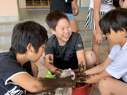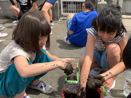 まずは、土づくりです。バケツに土と水を入れかき混ぜます。ドロドロになった土の感触を楽しみながら、必死になって混ぜていました。できた土は、ペットボトルのマイ田んぼに入れていきます。