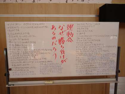 今日の全校道徳のテーマは「運動会、なぜ勝ち負けがあるのだろう」です。