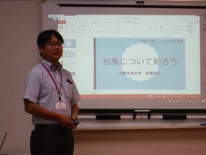 まずは、台風による風や高潮などの災害について教えていただきました。台風はどうやってできるのか、昨年度に発生した台風21号でどのような被害があったのか、また台風は遠くにあっても危険であるということなど、台風に関する様々な事を学ぶことができました。