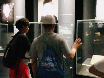 原爆ドームに到着し実際に原爆ドームを目の前にすると、みんないっきに表情が変わります。当時の物や写真など戦争の悲惨さにふれて、子どもたちはいろいろなことを感じとっているようで、しおりにたくさん書き込んでいました。書いたことは、この後、夜のミーティングで伝え合います。