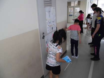 今日は2年生の身体測定がありました。廊下に貼ってある足型マークに並んで、距離をあけながら測定することができました。