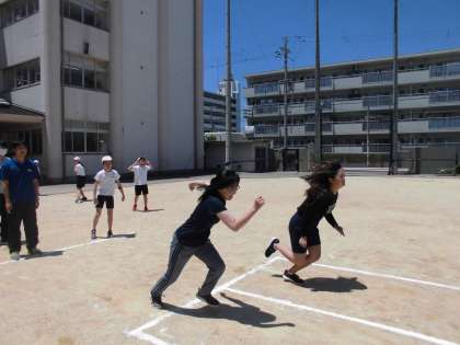 ウォーミングアップが終わると、運動場に出て50メートル走です。