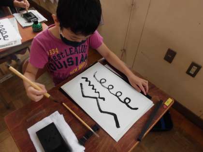 学習が始まると「筆ってこう持つんや」「書くの難しい」と言いながらも、子どもたちは直線やジグザグの線やグルグルの線を書くことにチャレンジ!半紙の下に手本の紙を敷いてなぞったり、なぞった線を見ながら自分で書いたりしました。