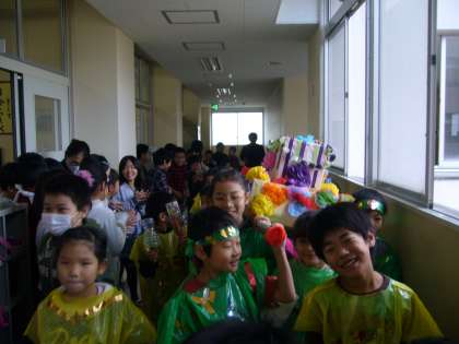 という1,2年生の元気な声が学校中に響き渡りました。2年生がおみこしをかつぐと、1年生はその周りにマラカスを手に持って大はしゃぎ!各教室の前をねり歩きました。3年生から6年生までのみんなも1,2年生の声が聞こえると廊下へ出て、応援してくれました。楽しい秋のフェスティバルの幕開けです。