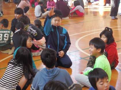 先週の1週間のことだけを先週のテーマの「いじめって?」を思い出し、自分のまわりにいじめがなかったかを考え、子どもたちは1〜6年生の小グループになり、伝え合います。