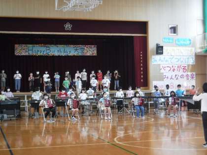 感染症の影響で講堂に全員が集まることはできません。そこで、1〜5年生はそれぞれの学習をビデオにおさめたものを教室のスクリーンに映し伝え合います。リーダーは講堂でこのHappy Birthday 大空の司会、進行をし、自分たちの演奏は生中継します。