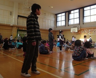 校長先生が、集合の合図をしました。子どもたちは自分の場所を見つけて集まります。