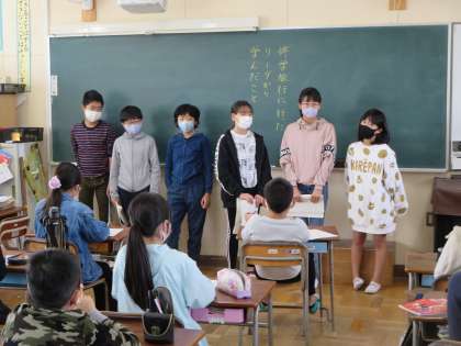 リーダーが各教室に分かれ、修学旅行で学んだことを伝えました。リーダーの話を聞いた子どもたちは戦争や原子爆弾の怖さを知り、改めて平和の大切さを感じました。みんなの質問に対して、リーダーは難しい言葉をわかりやすく説明したり、平和記念資料館で見たことを詳しく伝えたりし、学びを深めることができました。