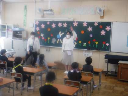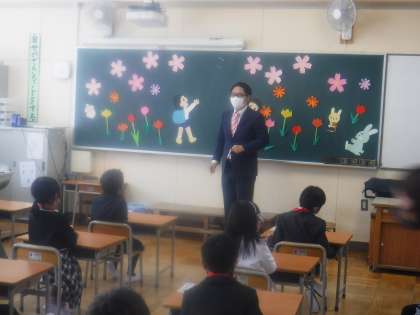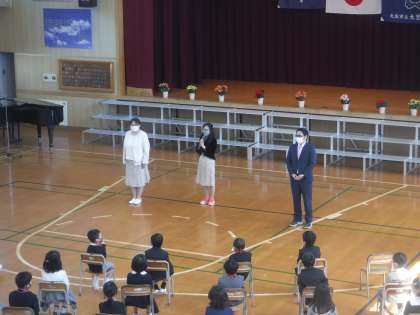 式での校長先生からのメッセージでは、一人ひとりの児童の名前が呼びあげられ、みんな元気に手をあげ、大きな声で返事をしていました。