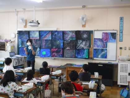 4年生の図工では、「すてきな宇宙」というテーマで絵具をつかって、スパッタリングという技法で、思い思いの宇宙を描きました。