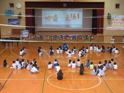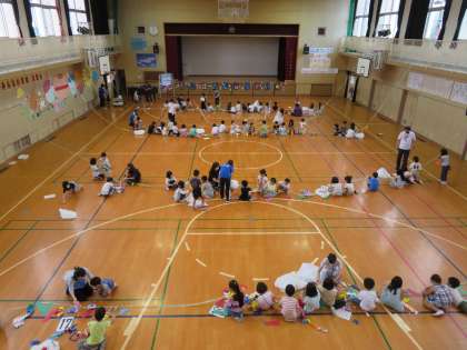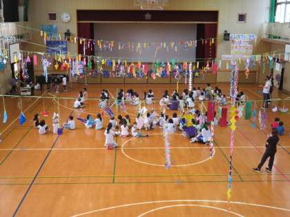 大空小の講堂の天井いっぱいに張りめぐらされた笹テープにたくさんの短冊と色とりどりの飾りが吊り下げられました。みんなの願い事が叶いますように。