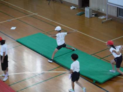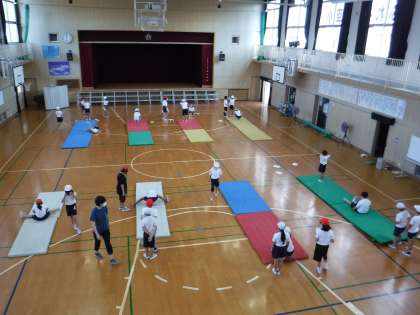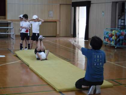 マット運動の様子です。開脚前転、開脚後転などを、一つ一つのポイントを意識しながら、練習しました!