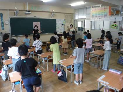 1年生では、はぐくみネットの岩切先生と河合先生による「えいごのがくしゅう」がありました。英語であいさつをしたり、じゃんけんをしたり、あいさつのうたを歌ったりするなどして楽しく学習することができました。