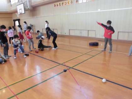 まずは、ボールを投げたり転がしたりしてフープや線を狙ってみます。想像よりもボールが重たくて、思ったように転がらない子どもたち。次はいよいよゲームです。ルールもやりながら覚え、チームのメンバーで協力してプレイ。審判にもチャレンジします。勝っても負けても大盛り上がりのボッチャ体験となりました。