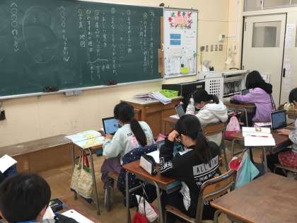 「ふるさとの食を伝えよう」では、地域の特産物について各自、タブレットで調べ学習をしました。大阪の「たこやき」や秋田の「きりたんぽ」、淡路島の「たまねぎ」などなど、たくさんの特産品を見つけていました。