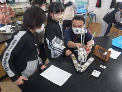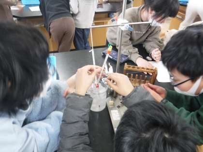 「水を冷やすとどうなるのか」の実験をしました。試験管の水の温度が氷点下になると、凍り始めました。「凍って、温度計が抜けなくなったぁ〜!」と大騒ぎでした。