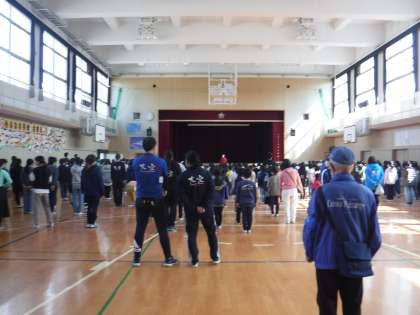 続いて、運営委員会から、いつもお世話になっているパトレンジャーさんや図書レンジャーさん、調理員さん、友だち、サポーターのみなさんに向けて、ありがとうの花の感想を伝えました。いつも子どもたちの安全を見守ってくれるパトレンジャーさんは、講堂に来てくださっていたので、直接感謝の気持ちを伝えることができました。