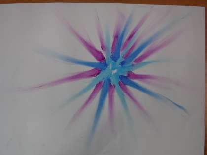 少しずつ画用紙の方向を変えながら、円状にクレパスの丸を描き並べます。次の段はそれらの丸と丸の間に丸を描きます。