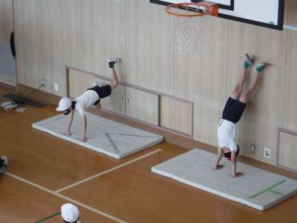 1時間目、講堂で「かべ倒立」の学習をしました。