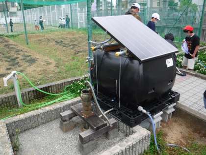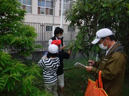 ファーム内生き物探し、ファーム内の井戸、子どもたちの様子です。
