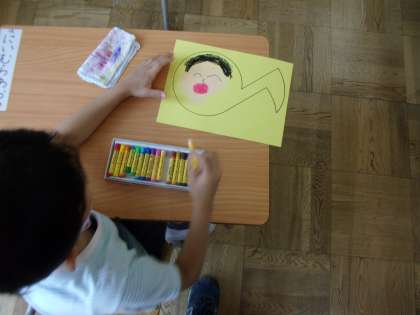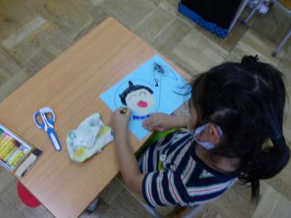 音符の形の紙に、自分の似顔絵を描きました。